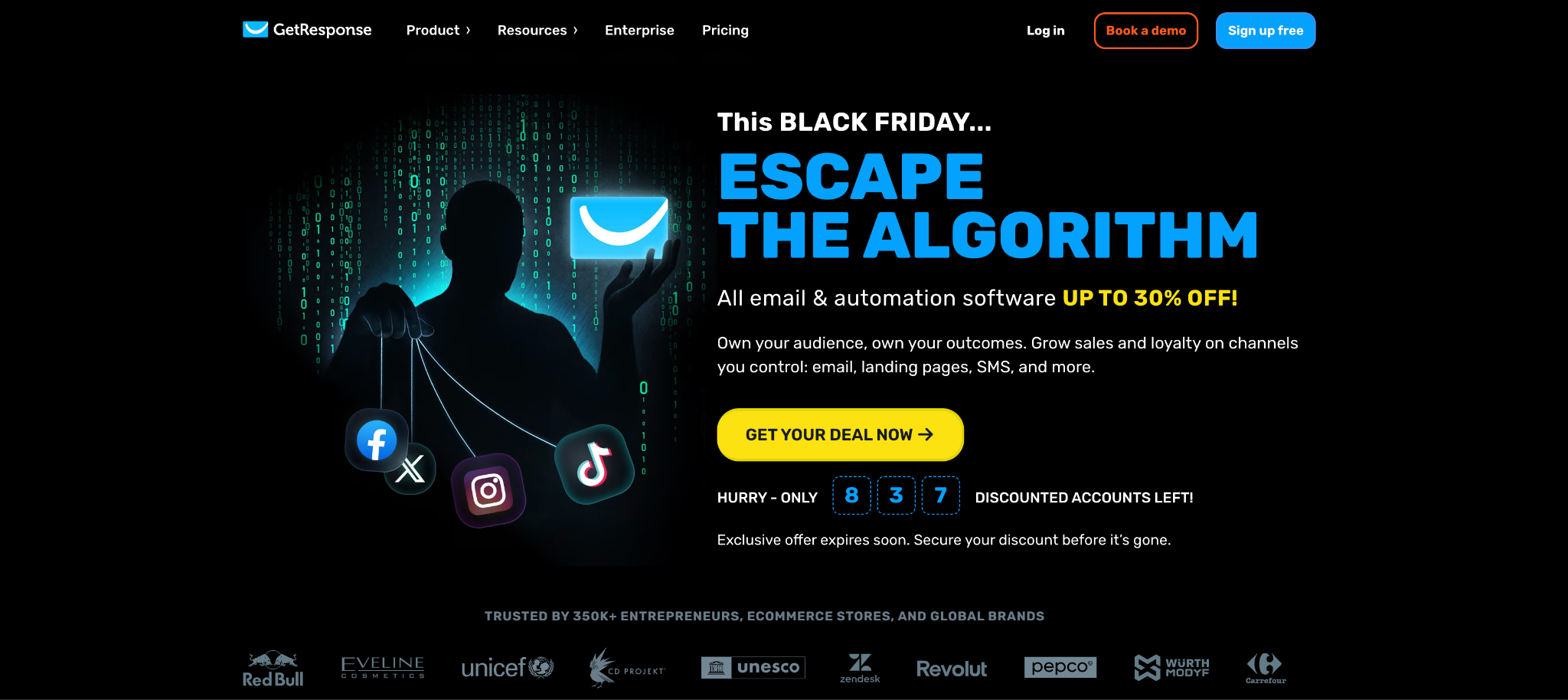 GetResponse is an AI-driven email and automation platform that helps businesses grow smarter on the channels they own. It offers unlimited sends, transparent pricing, and powerful ecommerce-ready automation.