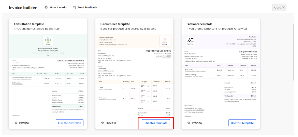 - You will find different invoice templates. Select the one that you find the best, to start creating the invoice. To start with a particular template, click on the ‘use this template’ option.