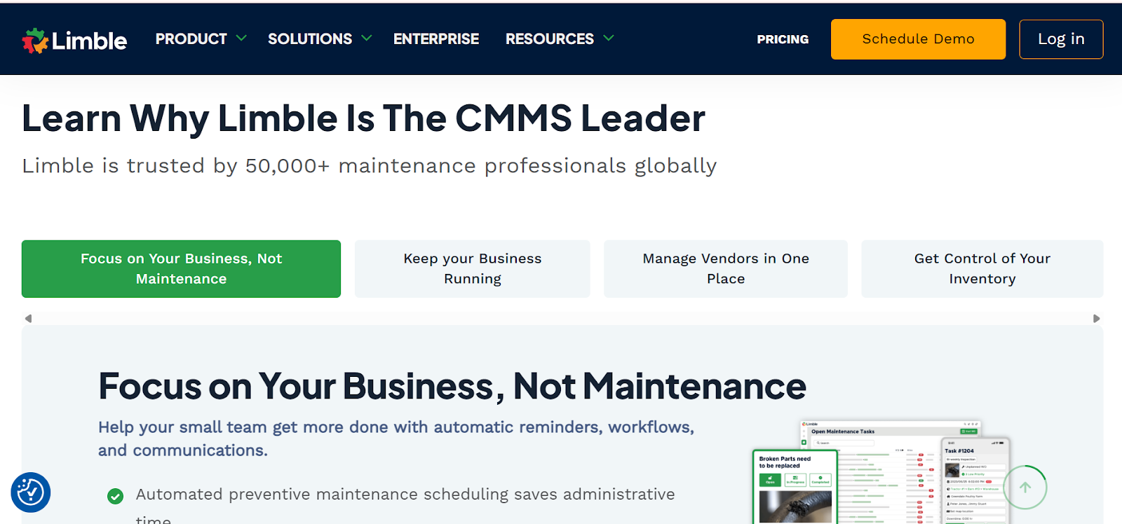 Limble CMMS (Computerized Maintenance Management System) focuses on technician productivity and preventive maintenance execution for small and mid-size maintenance teams.