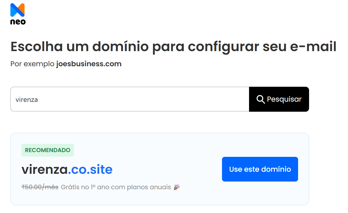 O Neo oferece um domínio .co.site gratuito, perfeito para empresas que precisam apenas de um endereço de e-mail profissional.
