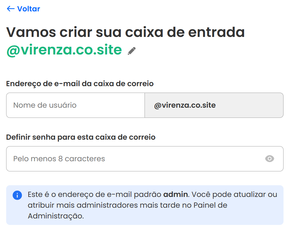 Escolha o endereço principal, como seunome@suaempresa.co.site, garantindo credibilidade e consistência nas comunicações.